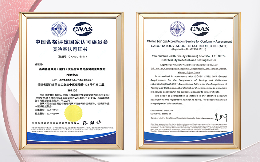 燕鸿基燕窝质量研究与检测中心于2022年3月通过CNAS(中国合格评定国家认可委员会)认可并取得证书。